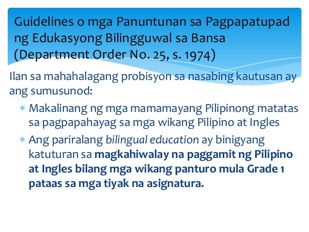 Ang wika ang isa sa mga paraaan upang maipahayag natin. 1939 Maaaring gamitin ang mga unang wika bilang auxiliary na wikang panturo lalo na para sa mga mag-aaral sa unang baitang kaya ang kauna-unahan nating programang bilingguwalismo ay binubuo ng wikang Ingles at isa sa ating mga unang wika. Katulad na lamang ng mga prekolonyal na likha ng ating mga sinaunang Pilipino inihahayag nito ang kaisipan at uri ng pamumuhay ng ating mga ninuno.