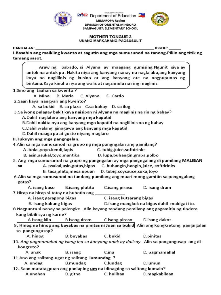 Unang markahang pagsusulit sa mtb3. Komunidad ang tawag sa binubuo ng pamilya paaralan pamahalaan simbahan. View Unang-markahang-pagsusulit-sa-MTB-3-2015-2016docx from Arts MISC at University of Santo Tomas. UNANG MARKAHANG PAGSUSULIT SA KOMUNIKASYON 11.